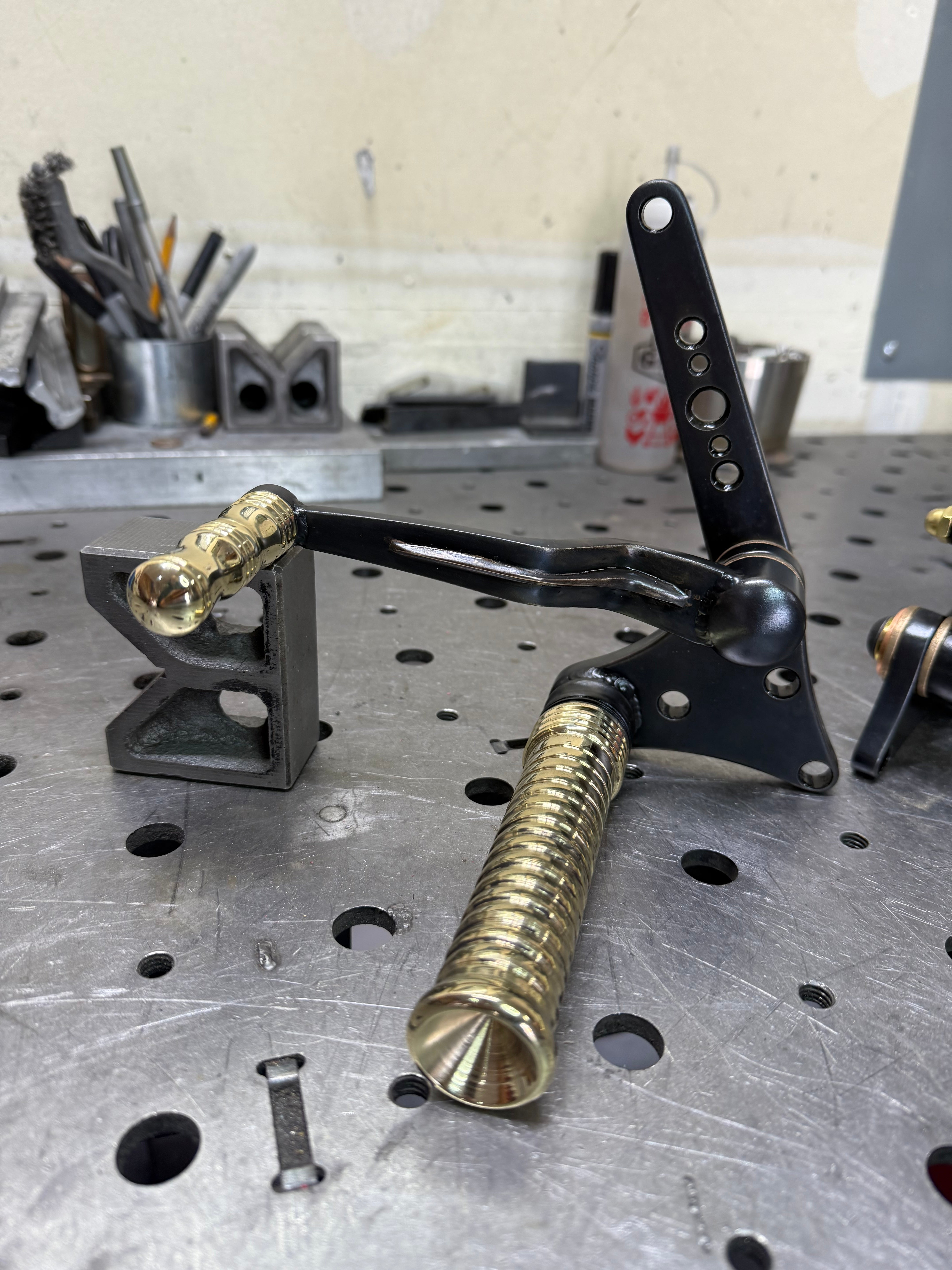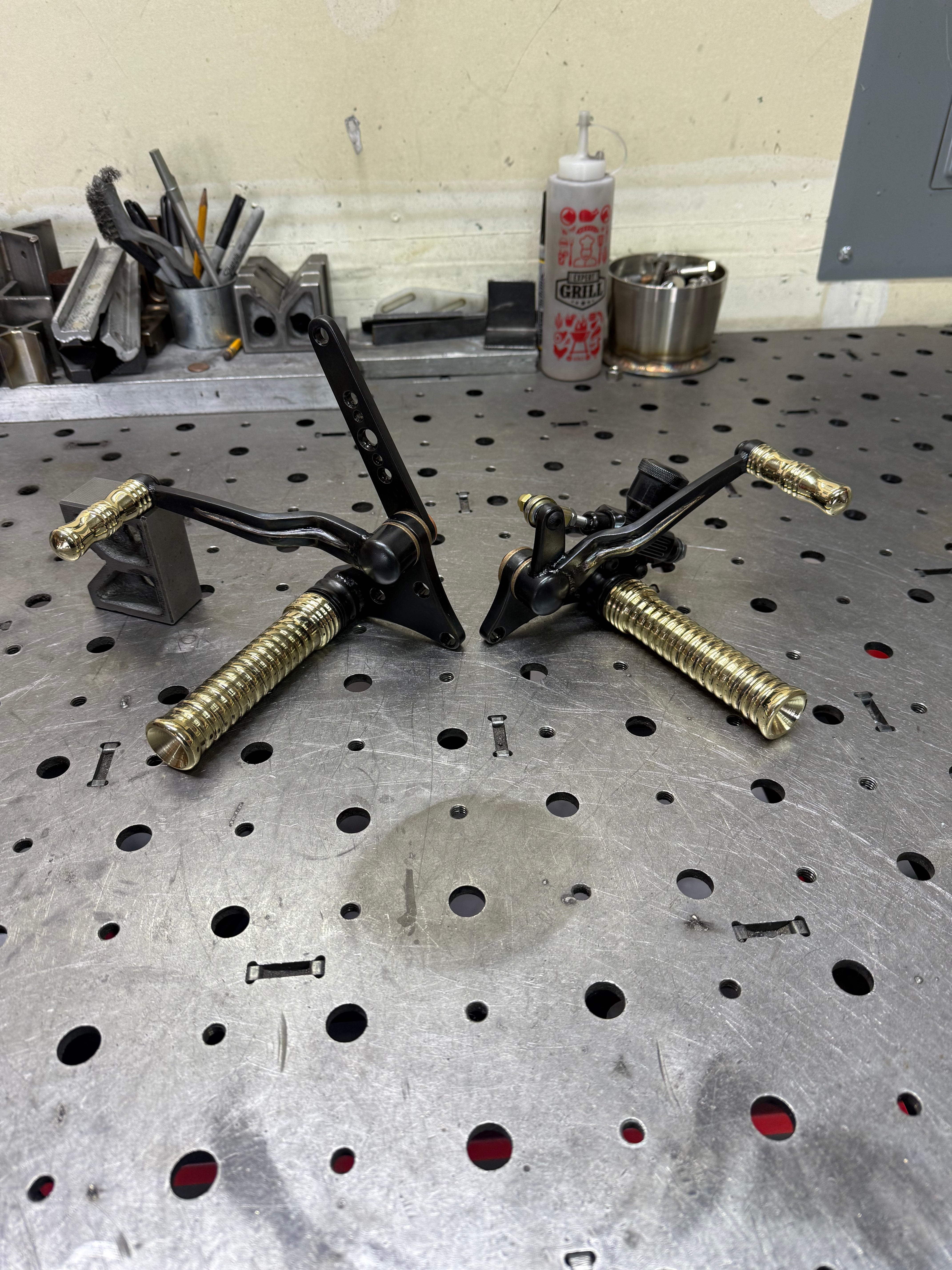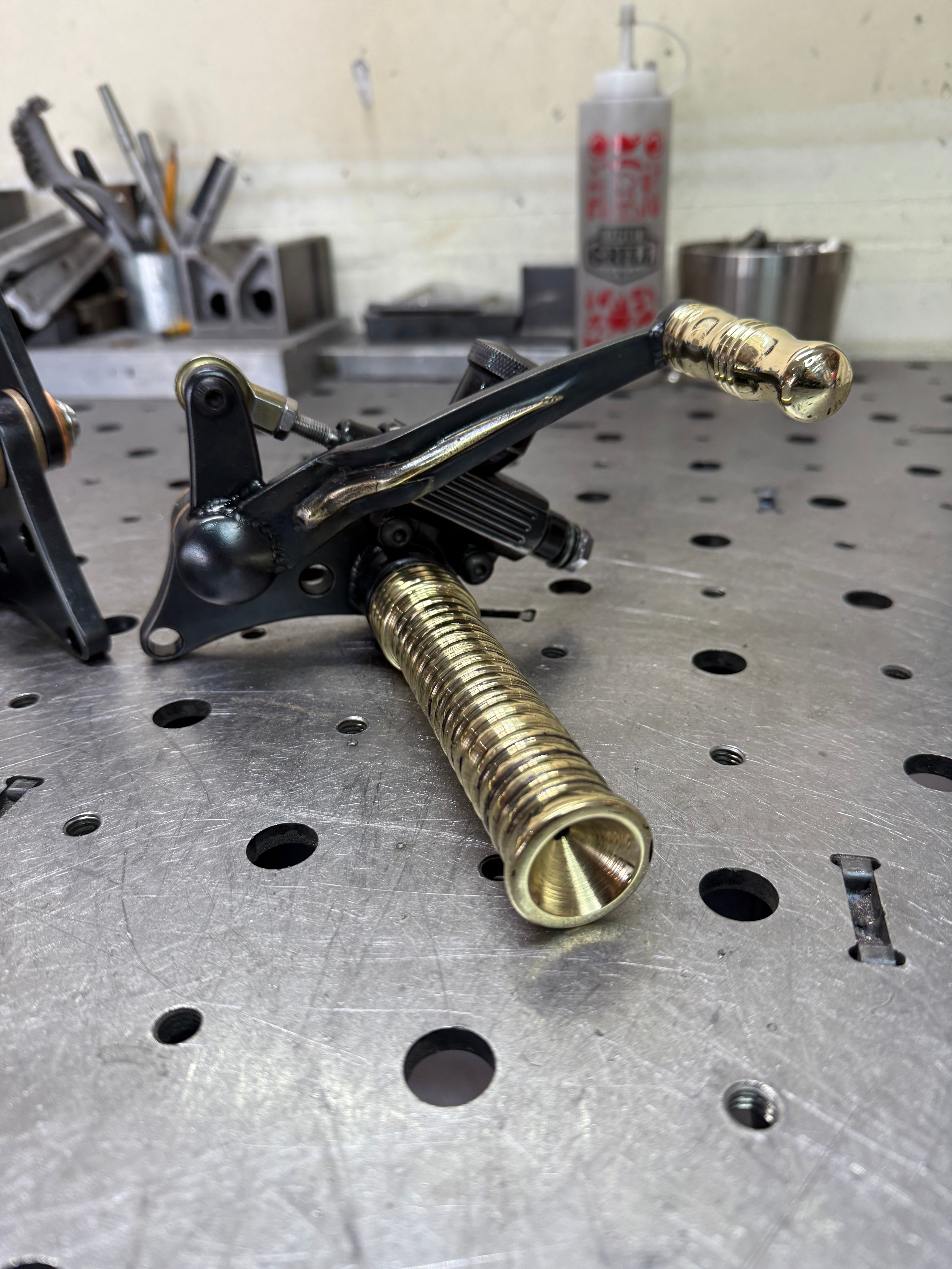 These one off controls based on our original diamond pedal platform are chemically aged similar to a gun bluing process to give the finish an antiqued look. Contrasted with the polished brass pegs and toe pegs they make for a unique atheistic perfect for any custom build.